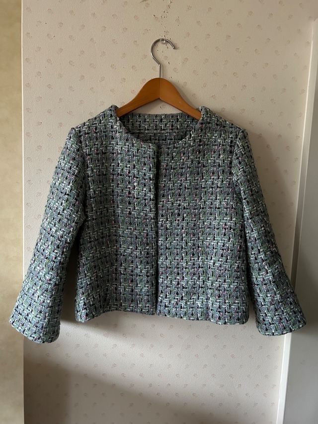 ツイード生地を使ったジャケットの材料セットです お色が2色ございます。 ブルー、からし色 材料 ツイード生地、接着芯、鍵ホック、実物大パターン サイズ M:B95㎝ 丈49㎝ 袖丈47㎝