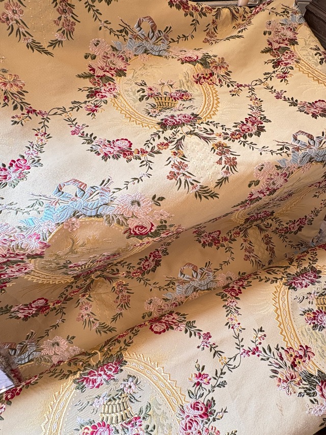 花柄ジャガード生地 華やかな花柄が織り込まれたジャガード生地 明るいイエロー系の色合いです バッグや小物、インテリアにも 290㎝巾 50㎝単位のカットになります。 ※ 実際のお色は、写真の撮り方により異なる場合がございます