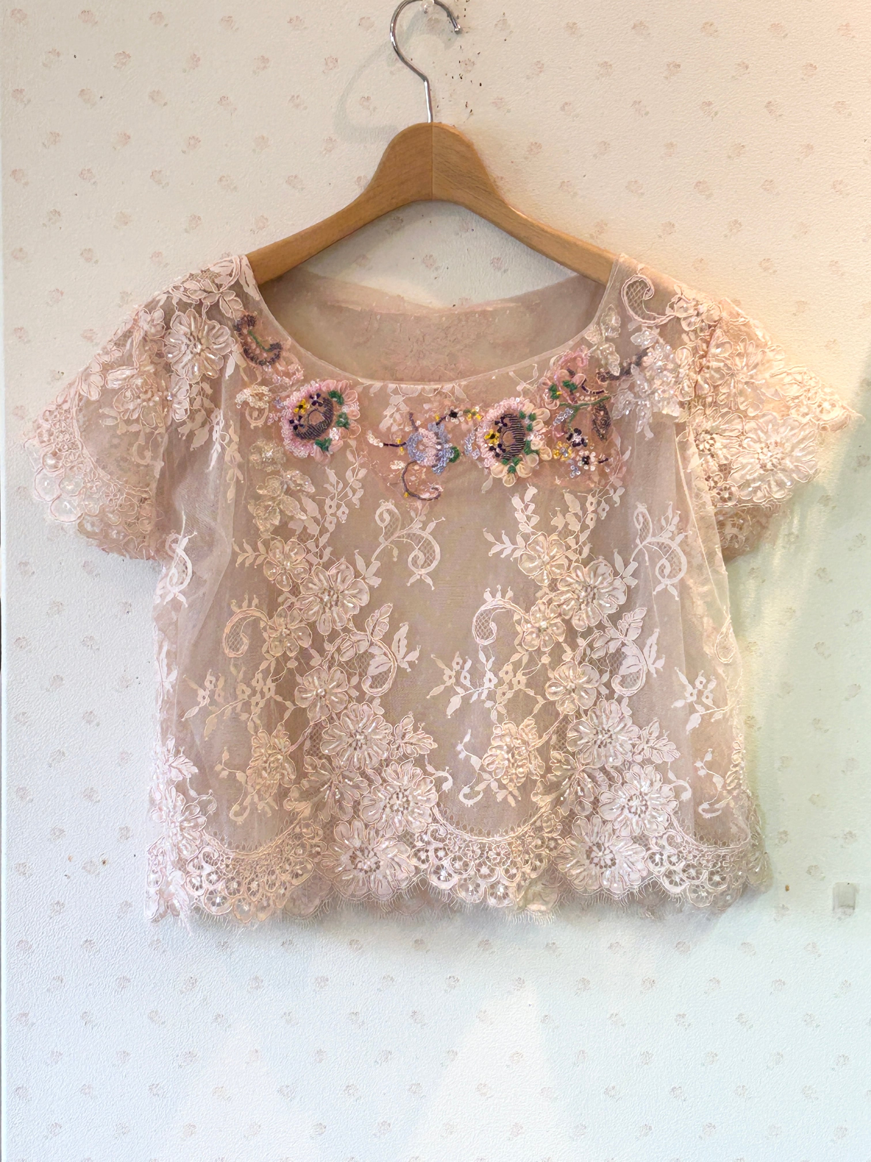 ソルスティスのビーズパーツを使用した美しく繊細なデザインのビーズブラウスです。華やかでゴージャスなブラウスは普段使いはもちろん特別なシーンなどあなたを引き立てます。