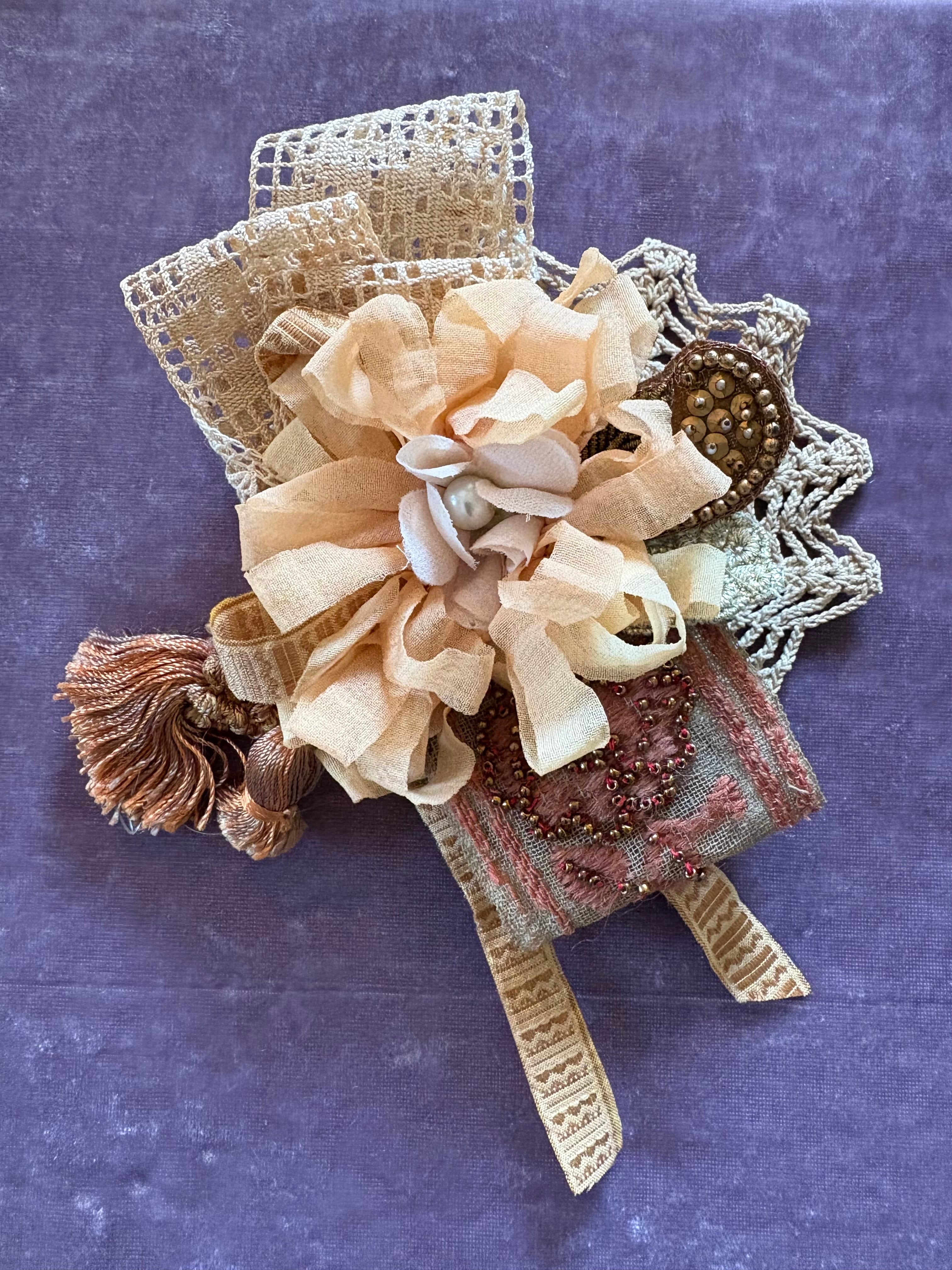 アンティークなレース、りぼん、小物を使ったコサージュ