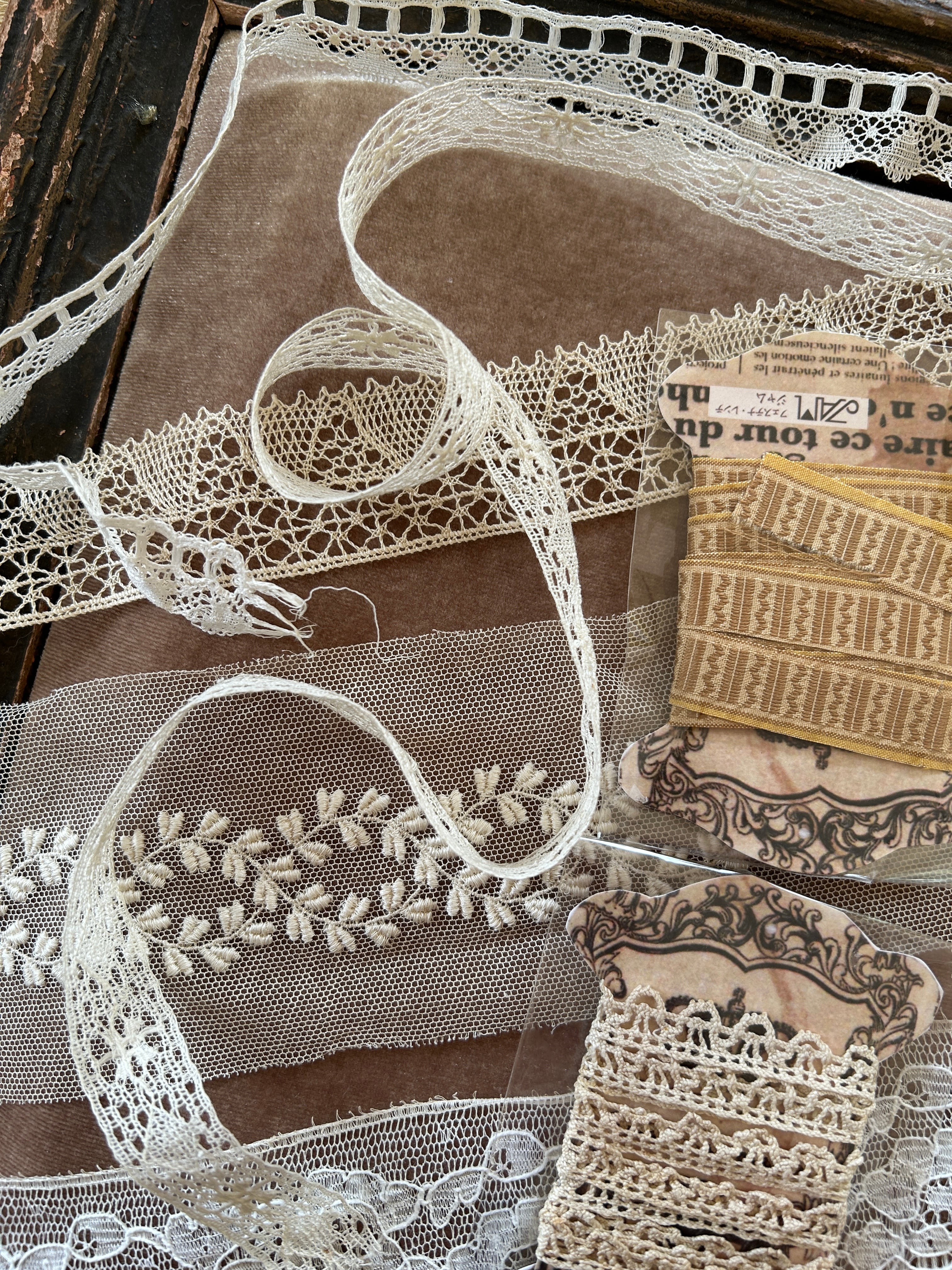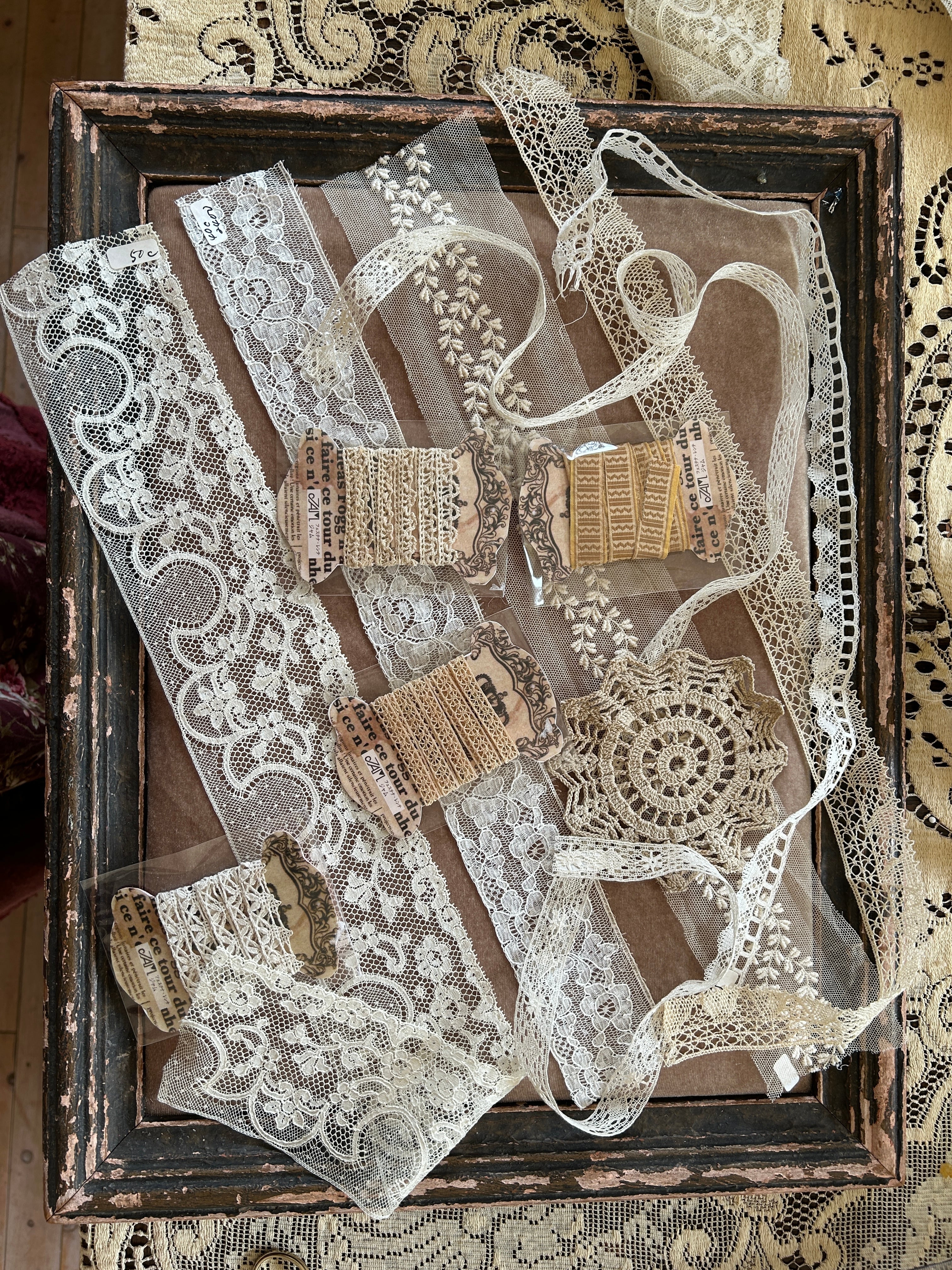 状態のいいアンティークレースを取り揃えました。5ミリ巾〜7c幅まで幅広く、白、きなり、 ベージュと色もさまざまです。