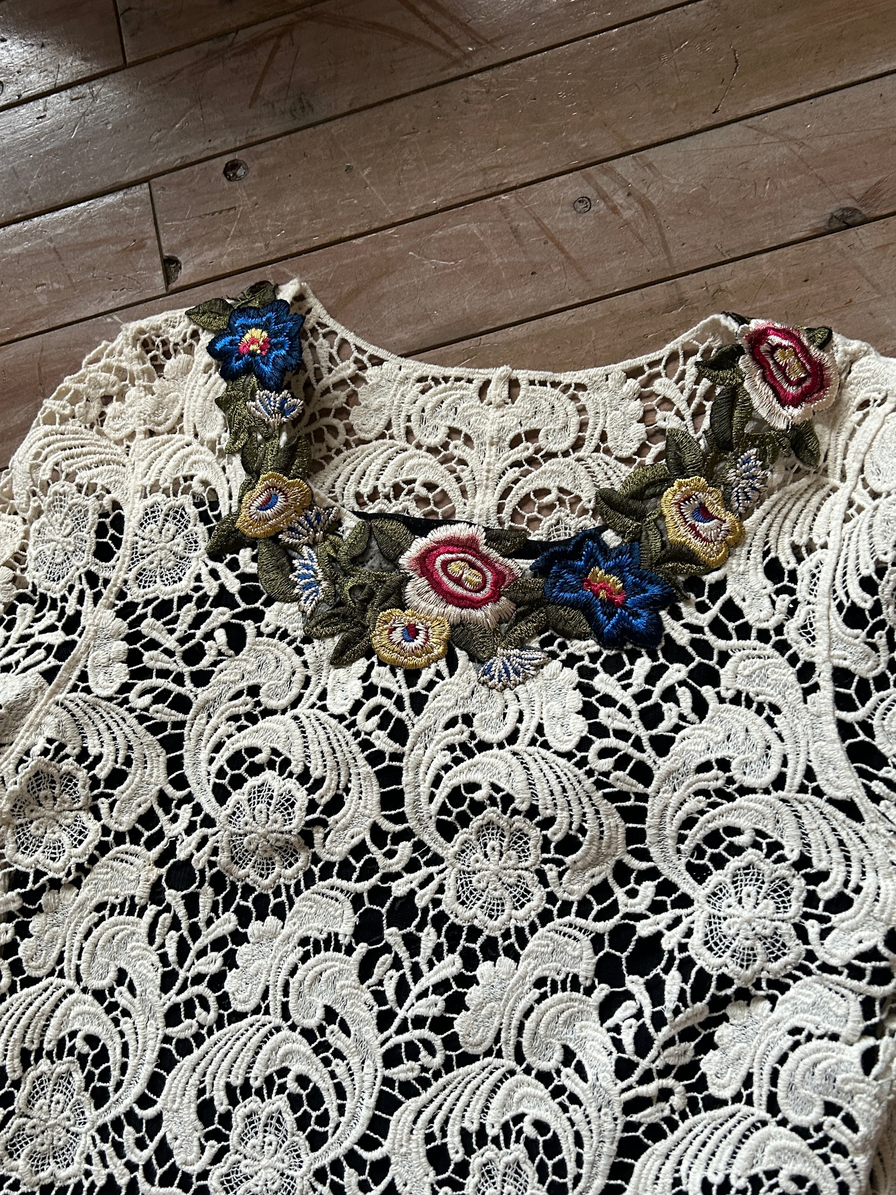 ざっくり感のあるソフトな木綿のレースブラウス、首元 刺繍飾り付き