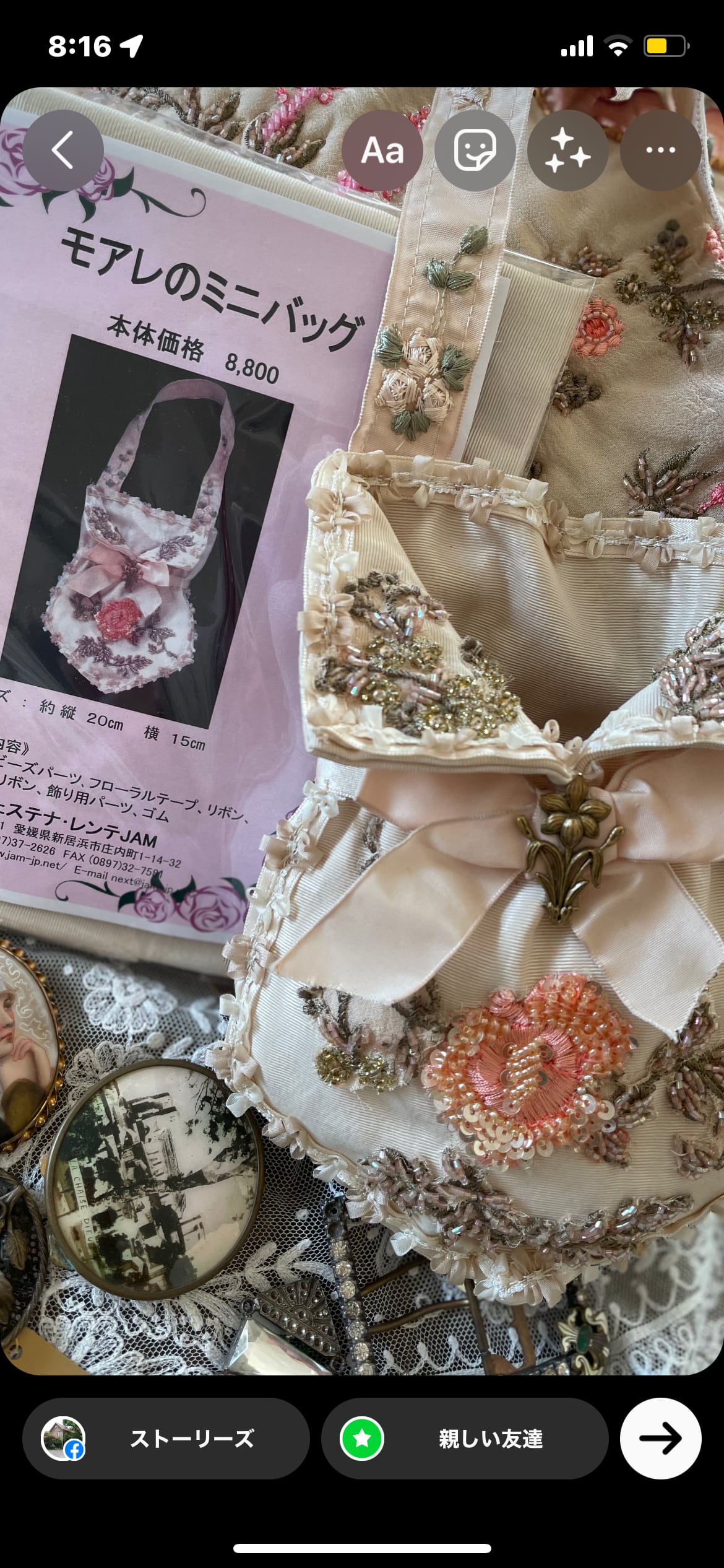 生成りモアレにカットしたビーズ刺繍生地をアップリケ ゴージャスなミニバック 縦20c×横15c 全ての材料入り
