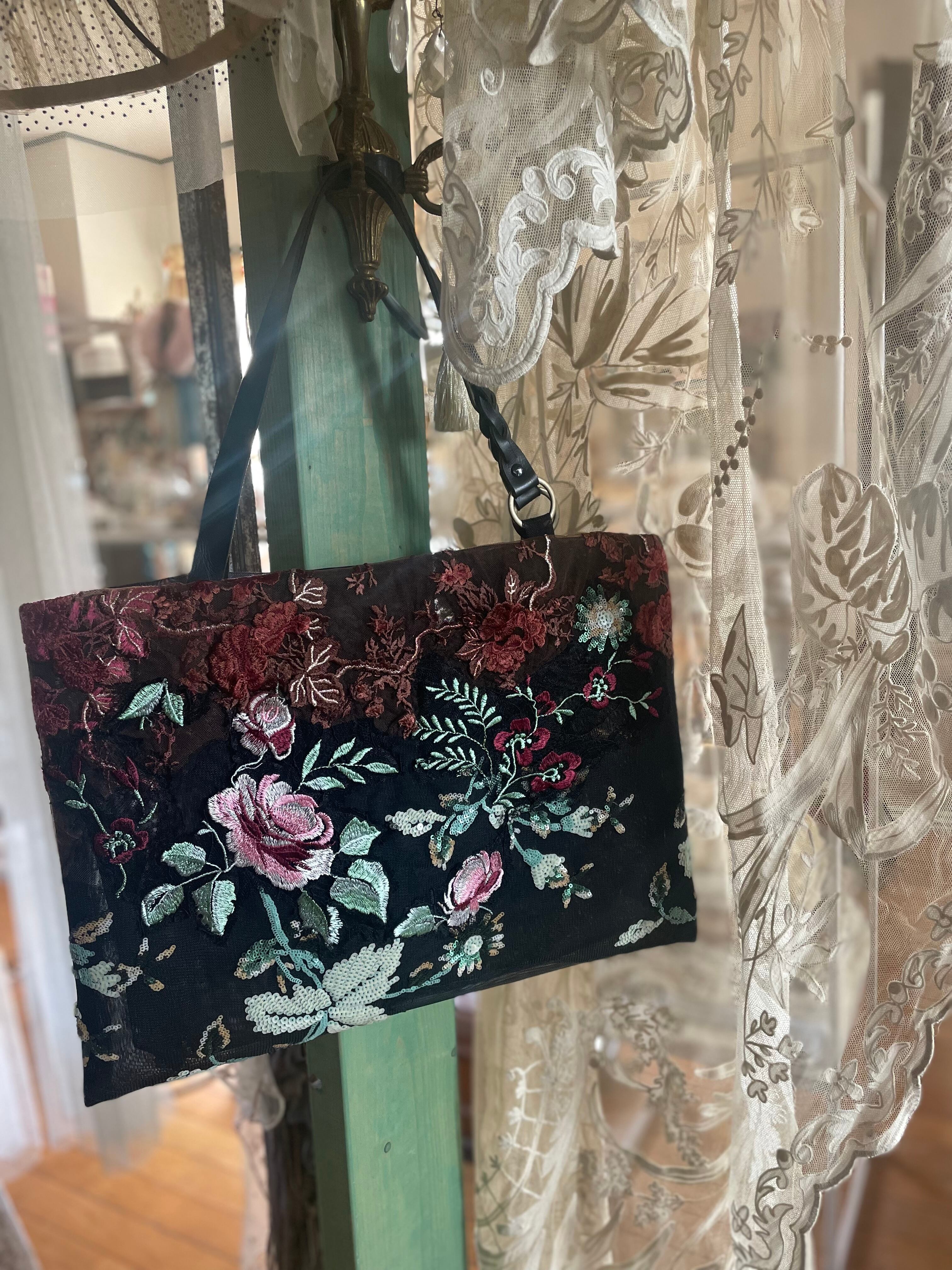 刺繍生地デコレーションのメッシュバックキット 刺繍生地、メッシュ革持ち手、レシピ サイズ:縦33㎝ 横45㎝