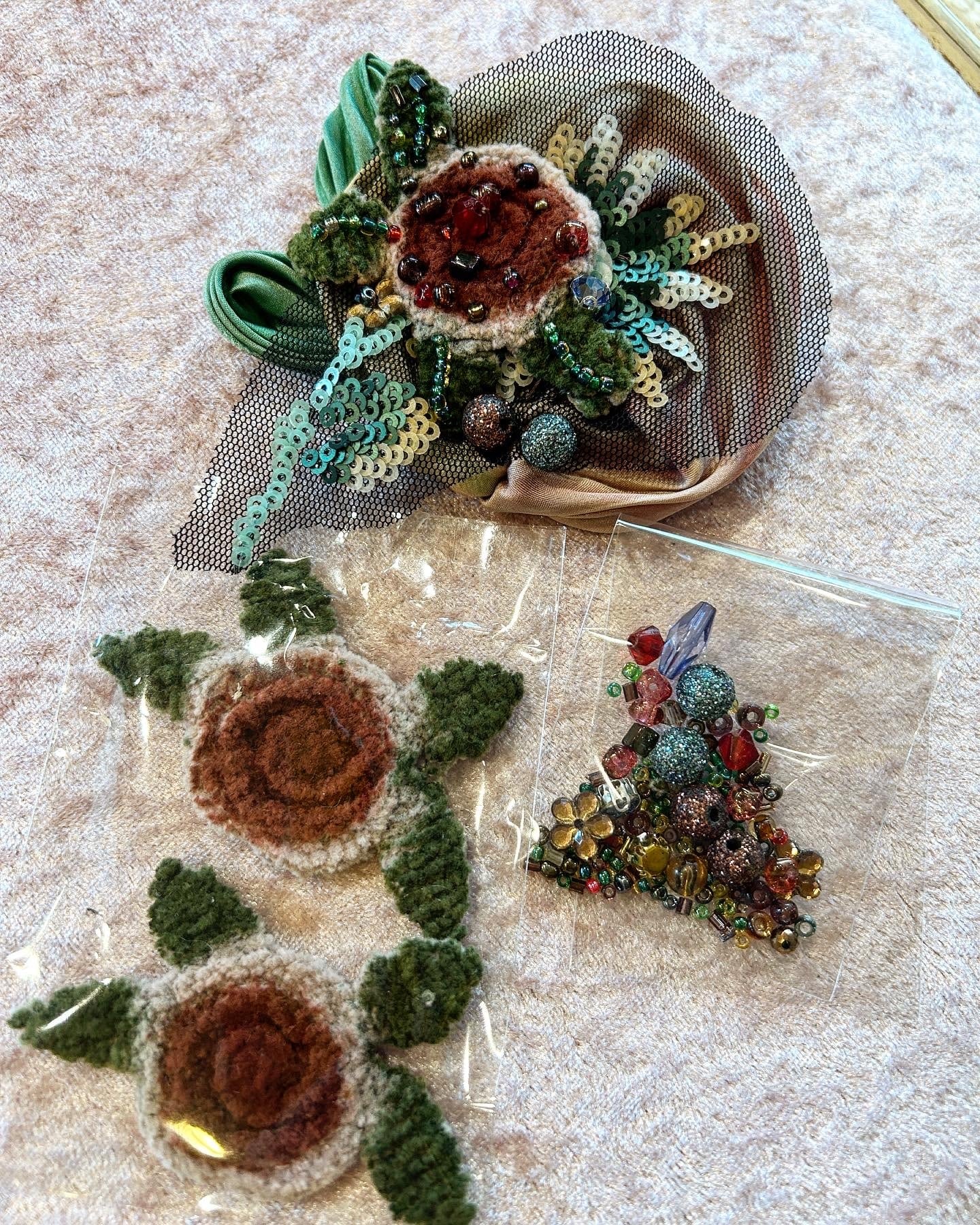 オリジナルなモール薔薇2個とビーズのセット